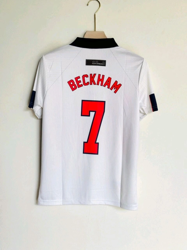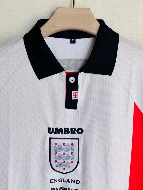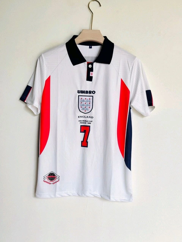 This retro Umbro England football jersey from the 1998 World Cup features a white base with bold red and navy accents, an embroidered team crest, and the iconic number 7 print, making it a must-have for football fans and collectors.